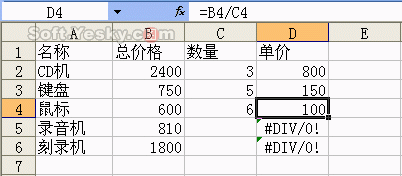 具體實(shí)例:如圖1的所示的工作表,我們利用公式根據(jù)總價(jià)格和數(shù)量計(jì)算單價(jià),在D2單元格中輸入的公式為“=B2/C2”,把公式復(fù)制到D6單元格后,可以看到在D4、D5和D6單元格中返回了“#DIV/0!”錯(cuò)誤值,原因是它們的除數(shù)為零或是空白單元格。