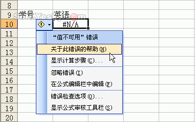 說明二:出現(xiàn)“#N/A”錯(cuò)誤的原因還有其他一些,選中出現(xiàn)錯(cuò)誤值的B10單元格后,會(huì)出現(xiàn)一個(gè)智能標(biāo)記,單擊這個(gè)標(biāo)記,在彈出的菜單中選擇“關(guān)于此錯(cuò)誤的幫助”(如圖6),就會(huì)得到這個(gè)錯(cuò)誤的詳細(xì)分析(如圖7),通過這些原因和解決方法建議,我們就可以逐步去修正錯(cuò)誤,這對其他的錯(cuò)誤也適用。