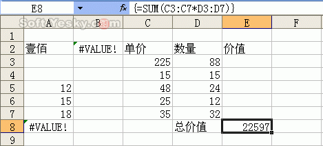 如圖17的工作表,如果要想用數(shù)組公式直接求出總價(jià)值,可以在E8單元格中輸入公式“{=SUM(C3:C7*D3:D7)}”,注意其中的花 括號不是手工輸入的,而是當(dāng)輸入完成后按下Ctrl+Shift+Enter鍵后,Excel自動(dòng)添加的。如果輸入后直接用Enter鍵確定,則會(huì)出現(xiàn) “#VALUE”錯(cuò)誤。