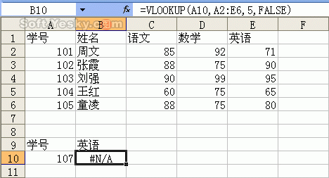 具體實(shí)例:在如圖4所示的工作表中,我們希望通過在A10單元格中輸入學(xué)號,來查找該名同學(xué)的英語成績。B10單元格中的公式為 “=VLOOKUP(A10,A2:E6,5,F(xiàn)ALSE)”,我們在A10中輸入了學(xué)號“107”由于這個(gè)學(xué)號,由于在A2:A6中并沒有和它匹配的值,因此出現(xiàn)了“#N/A”錯(cuò)誤。