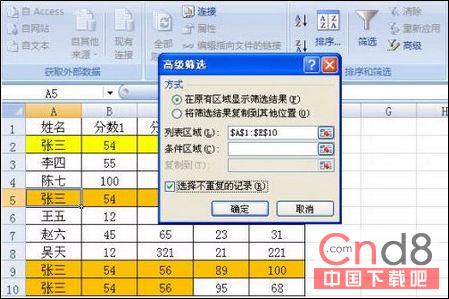 3.在彈出的“高級篩選”對話框中選中“選擇不重復的記錄”復選項,在列表區域框中將自動出現篩選區域的范圍,查看是否正確,不正確可用鼠標拖動重新選擇;此外,可選擇篩選結果的顯示方式,這里選擇的是“在原有區域顯示篩選結果”。如圖2。
