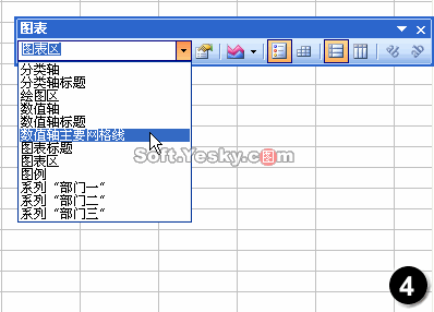 2. 如果“圖表”工具欄沒有顯示,請用前面介紹的方法打開它,接著單擊“圖表對象”下拉列表框的下拉箭頭,在彈出的列表中選擇“數值軸主要網格線”(圖 4),可以看到圖表中的網格線已經被選中。