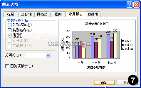 2. 進入“數據標志”選項卡,勾選“值”復選框,可以在右邊的預覽框中查看具體效果(圖 7)。