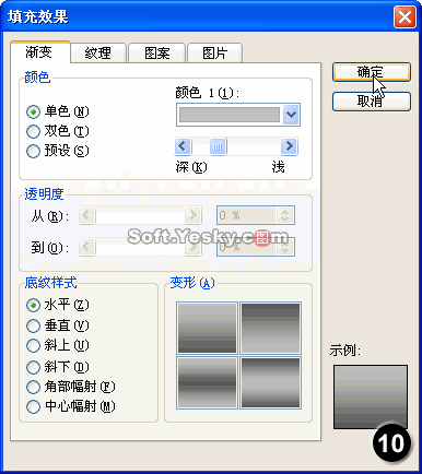 2. 單擊“填充效果”按鈕,打開“填充效果”對話框,在“漸變”選項卡的“變形”區,選擇第一個漸變效果,單擊“確定”按鈕(圖 10)。