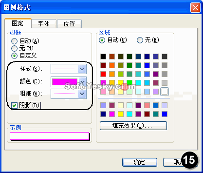 2. 在“邊框”區選擇顏色為紫色,然后勾選“陰影”復選框,單擊“確定”按鈕返回Excel編輯窗口。可以看到圖例的邊框變為紫色,并且帶有陰影效果(圖 16)。 原文件下載