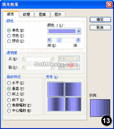 3. 在“漸變”選項卡內,“底紋樣式”區點選“垂直”單選框,然后在“變形”區選擇第一種漸變效果(圖 13),單擊兩次“確定”按鈕返回Excel編輯窗口。
