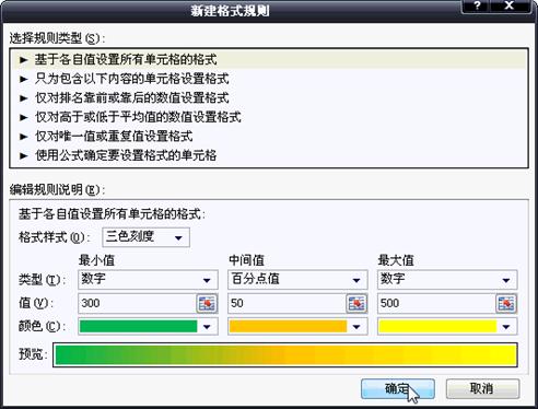 先單擊“格式樣式”右側的下拉按鈕,在隨后出現的下拉列表中,選擇一種樣式;再設置“最小值”、“中間值”、“最大值”的類型,并根據表格的色彩搭配,調整好顏色。全部設置完成后,單擊“確定”按鈕返回即可,如下圖所示。