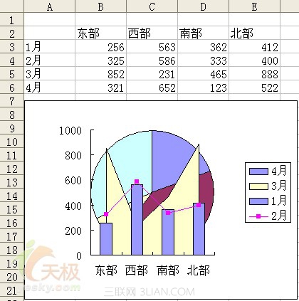 3.用同樣的方法將第3個和第4個數據系列的類型分別改為面積圖和餅圖,得到如圖4所示的結果,這樣我們就得到了一個同時具有4種類型的組合圖表。