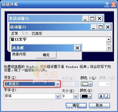 在“高級外觀”對話框中,在“項目”下方選擇“工具提示”,然后就可以設置提示內容的字體、字號、文本顏色、粗體斜體以及提示框的背景顏色等屬性了。