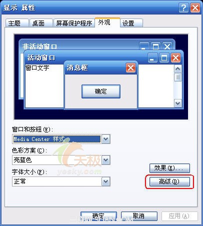 以Windows XP系統為例,當打開“顯示屬性”對話框后,單擊上方的“外觀”選項卡,然后單擊右下方的“高級”按鈕,如圖5所示。
