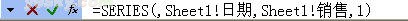 4.激活圖表并選中數據系列,可以看到在編輯欄中的未更改公式是這樣的:=SERIES(Sheet1!$B$1,Sheet1!$A$2:$A$10,Sheet1!$B$2:$B$10,1),下面這一步很關鍵,我們要做一個替代,現將公式更改如下:=SERIES(,Sheet1!日期,Sheet1!銷售,1),如圖4所示。在更改后的公式中可以看到我們在第二步和第三步中定義的名稱:日期和銷售。