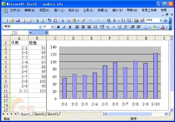 我有一朋友,是做銷售的。他利用Excel圖表來記錄每天的銷售成績。那天,他打來電話問了這樣一個問題:用Excel來記錄每天的銷售非常的方便,能夠直觀地表示出每天的銷售成績,但是因為每天都有新的數據,所以我不得不每天手動更改圖表來使其包含新的數據。有沒有一種方法可以讓我輸入新的數據時,圖表能自動更新。下面的方法將為他來解決這個問題。