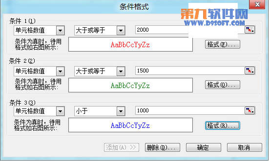 其實上述步驟可以更加簡單一點,直接單擊“格式”進入“條件格式”,一次性多添加兩個條件,然后填寫數據最后確定就OK了。多些步驟是希望大家更容易了解和掌握!