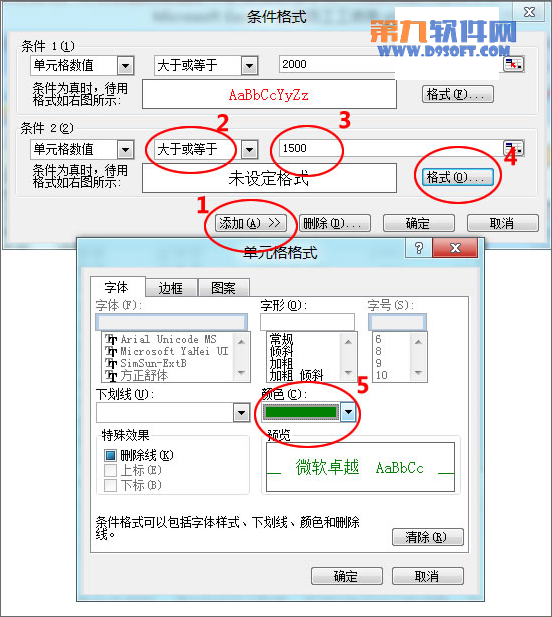 5、將大于或等于1500元工資總額設置為“綠色”。再次進入“格式”-->條件格式,單擊“添加”按鈕,在第二個方框中選擇“大于或等于”,在后面方框設置1500,單擊“格式”給數據字體顏色設置為綠色,最后確定。