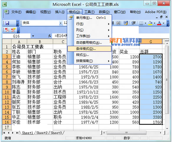 7、下面我們來將低于1000元的工資總額設置成“藍色”的。步驟和上面一樣,進入菜單欄的“格式”選擇“條件格式”。在彈出的“條件格式”中單擊“添加”,然后在第二個方框中選擇“小于”,在后面方框設置1000,單擊“格式”給數據字體顏色設置為藍色,最后確定即可。