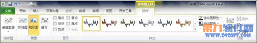 4、選中迷你圖表所在的單元格,軟件會展開“迷你圖工具/設計”功能選項卡,你可以利用其中的相關功能按鈕,對迷你圖作進一步的格式化處理。