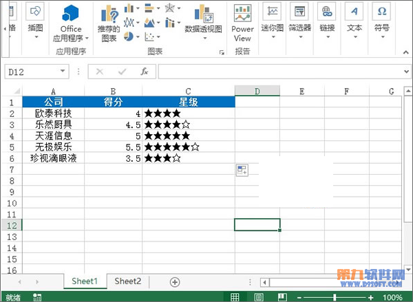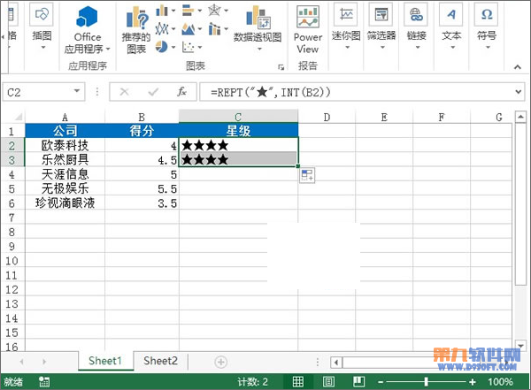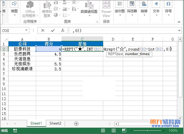 1、首先,我們打開一份表格,看到各個公司名稱以及評分,我們要做的是在等級列中,將評分圖形化,在C2單元格輸入:=REPT("★",INT(B2))。