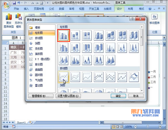 ⑤再來為圖表更改類型,點擊更改圖表類型選項,選擇柱形圖中的第一個。