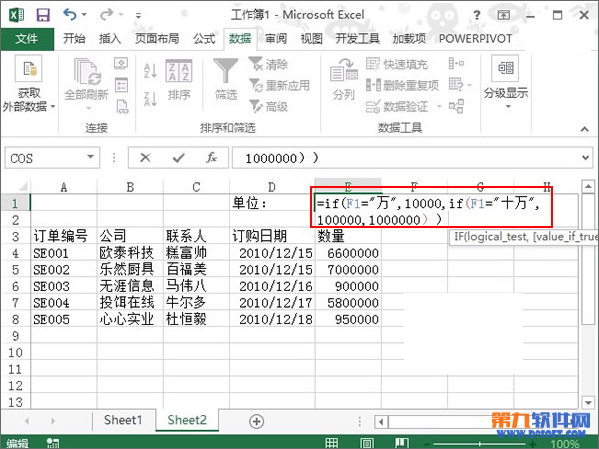 3、在E1單元格輸入公式,進(jìn)行數(shù)據(jù)判斷,=IF(F1="萬",10000,IF(F1="十萬",100000,1000000))