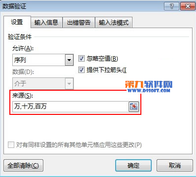 2、彈出數(shù)據(jù)驗(yàn)證對話框,在驗(yàn)證條件中允許選擇為序列,來源欄中輸入萬,十萬,百萬。之間的逗號要在英文半角狀態(tài)下輸入。