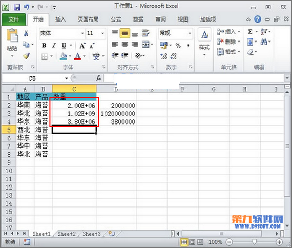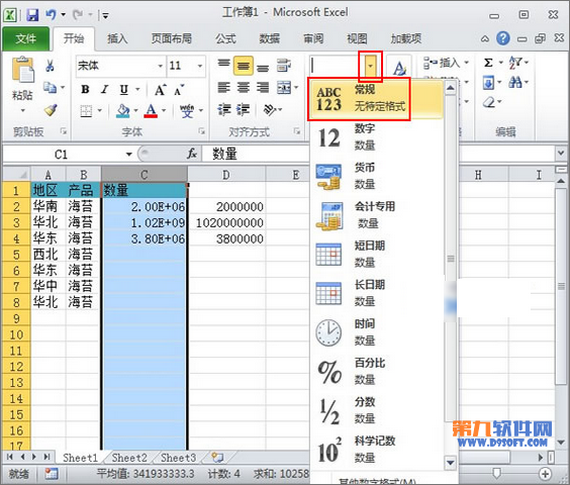 ③選中C列,單擊菜單欄--開始---數字功能組中的小三角,從下拉菜單中單擊常規無特定格式。