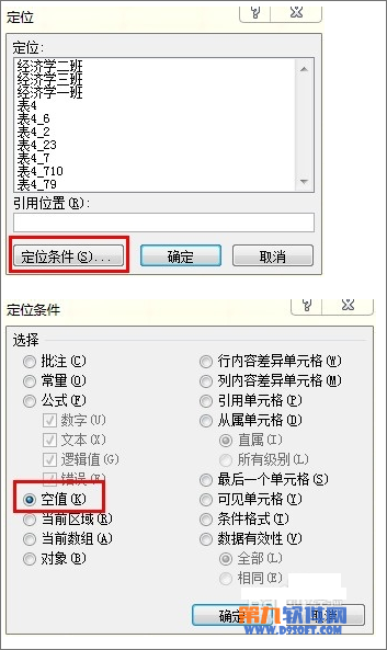 2、此時,按F5鍵打開定位,點擊定位條件按鈕,選為空值,