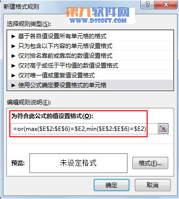 第二步:彈出新建格式規(guī)則對話框,我們將規(guī)則選擇為:使用公式確定要設置格式的單元格,然后為符合此公式的值設置格式。輸入下面的公式:=or(max($E$2:$E$6)=$E2,min($E$2:$E$6)=$E2)。