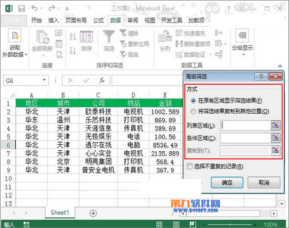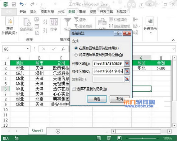 2、彈出高級篩選對話框,我們選取結果顯示方式,上面的是在原有區域顯示,也就是不保留原始數據。下面的是在其他位置顯示,保留原始數據,方便對比查看。
