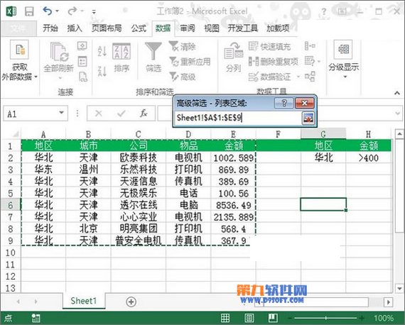 1、首先,我們打開一份數據表格,要篩選出華北地區金額大于400的選項。單擊菜單欄--數據--高級。