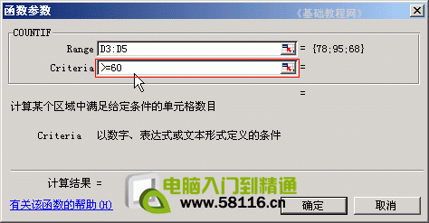 5)切換到英文輸入法,在函數面板的第二個文本框中輸入“>=60”,然后點“確定”,也就是60分以上算及格;