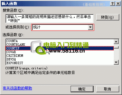 3)點一下編輯欄旁邊的“fx”,在出來的函數列表里面找到“統計”,在下面找到“COUNTIF”,點“確定”按鈕;