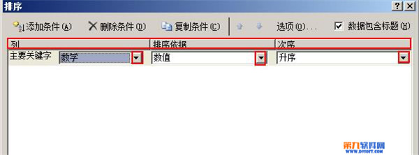2、接著窗口會彈出一個“排序”的對話框,在點擊“列”下面的“主要關鍵字”的下拉按鈕進行選擇,在“排序依據”下面的下拉按鈕選擇“數值”,“次序”選項組下面選擇“升序”然后點擊“確定”例如這里我們選擇“數學”這一列進行升序;
