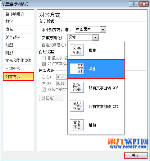 2、進入“設(shè)置坐標軸格式”對話框,單擊“對齊方式”,從“文字方向”的下拉菜單中選擇“豎排”或者你喜歡的顯示方式。按“關(guān)閉”按鈕。