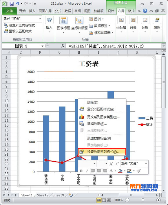 [2] 選中折線圖,單擊鼠標右鍵,從下拉菜單中選擇“設置數據系列格式”選項。