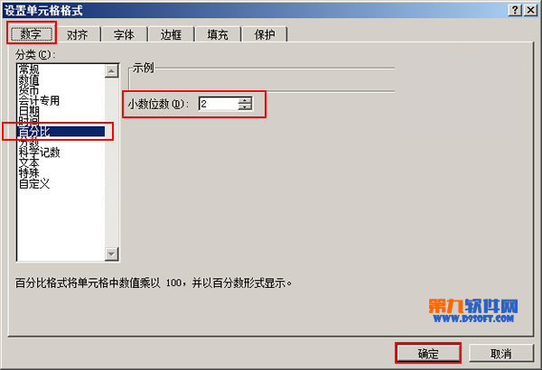 [2] 在彈出的對話框中切換到【數(shù)字】選項(xiàng)卡,選擇【百分比】,設(shè)置小數(shù)位數(shù)為【2】。完畢后單擊【確定】。