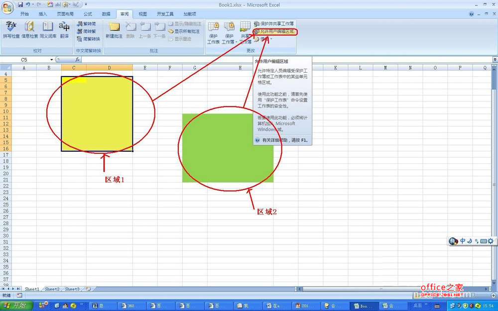 4、然后分別選定黃綠區域,分別設置區域密碼。首先在excel表功能區選擇“審閱”模塊,然后在工具欄中選擇“允許用戶編輯區域”。