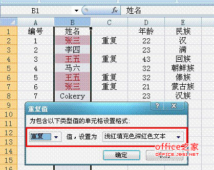 第三步、在彈出的“重復(fù)值”對(duì)話框中設(shè)置重復(fù)值顯示的樣式。