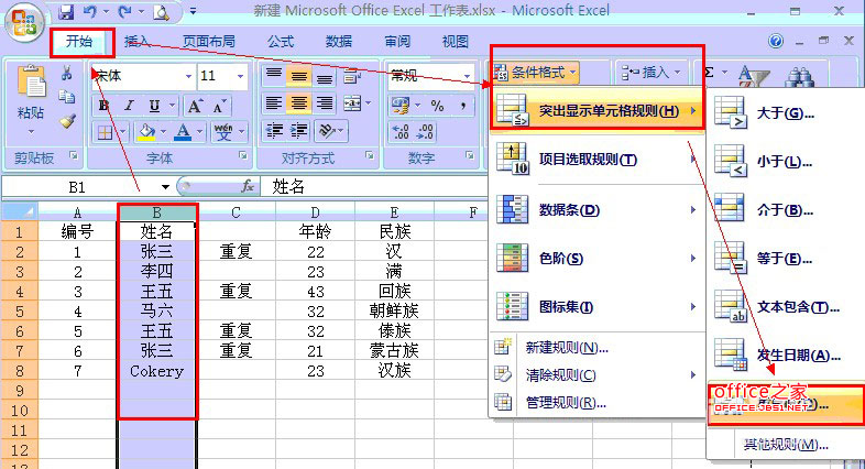 在使用Excel處理數(shù)據(jù)時(shí)經(jīng)?;赜龅胶芏嗟膯?wèn)題,比較常見(jiàn)的一個(gè)問(wèn)題就是如何篩選重復(fù)的名字,幾百人的姓名表中肯定會(huì)存在重復(fù)的,現(xiàn)在的需求就是如何篩選出名字重復(fù)的數(shù)據(jù)。經(jīng)搜索方法有很多,比如可以使用函數(shù)公式COUNTIF來(lái)實(shí)現(xiàn),也可不使用公式,Office2007自帶的突出顯示單元格規(guī)則中的重復(fù)值功能可實(shí)現(xiàn)查找重復(fù)數(shù)據(jù)。下面就將這兩種方法與大家分享下。本示例在Office2007版本下進(jìn)行,至于其他版本請(qǐng)自行測(cè)試。