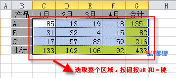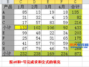 選取包括黃色行列的區域,按alt 和 = (按alt鍵不松再按等號)即可完成求和公式的輸入。