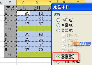 2、在定位條件窗口中選取“空值”會選中需要設置公式的空行和列。然后按alt和=號即可完成填充。