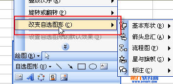 在繪圖工具欄中還有一個命令:改變自選圖形。通過它我們可以把單元格中的批注也設置成其他樣式。但在默認的功能區們,我們找不到這個命令,它被excel2010雪藏了起來。