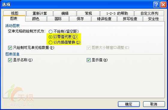 還有一種辦法是在空白單元格中輸入公式=NA()。這樣一來圖表就會為包含該公式的單元格使用內插值,而不管在“選項”對話框中選擇的是什么