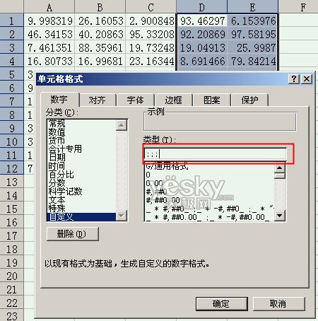 選中“數字”選項卡的“分類”列表中選中“自定義”選項,在“類型”框中輸入三個半角分號“;;;”,然后單擊“確定”按鈕。