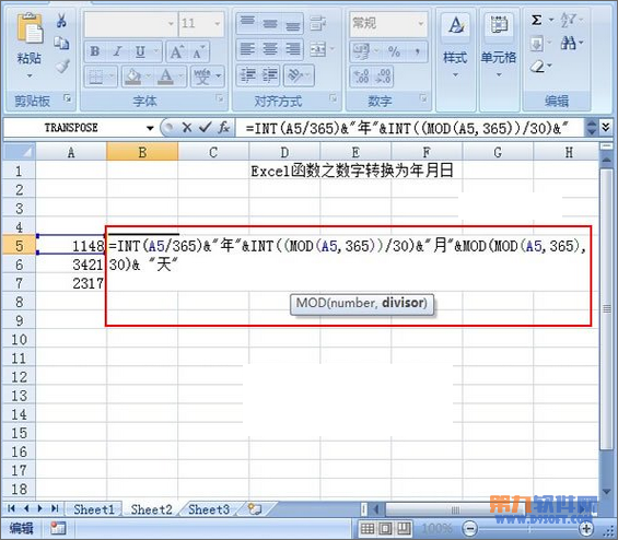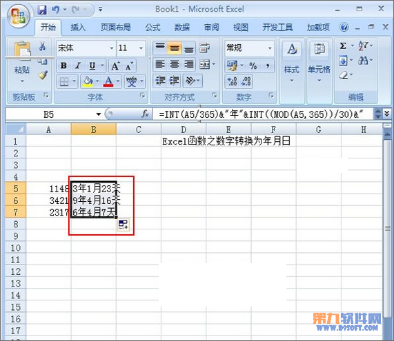 ②單擊B5單元格,輸入下列函數公式:=INT(A5/365)&"年"&INT((MOD(A5,365))/30)&"月"&MOD(MOD(A5,365),30)& "天",INT表示取整,MOD表示取余數,為了便于初學者學習,我按照的是一個月30天計算,否則函數公式過于復雜,大家看不懂。
