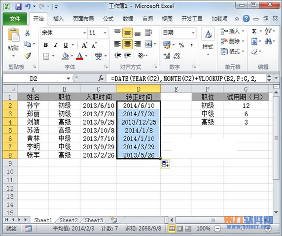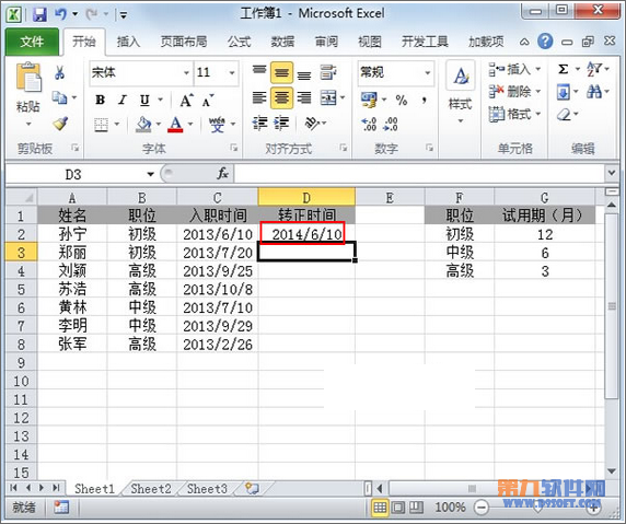 ②輸入完之后,按下Enter回車鍵,得到結果2014/6/10,因為孫寧是初級,所以需要1年時間。