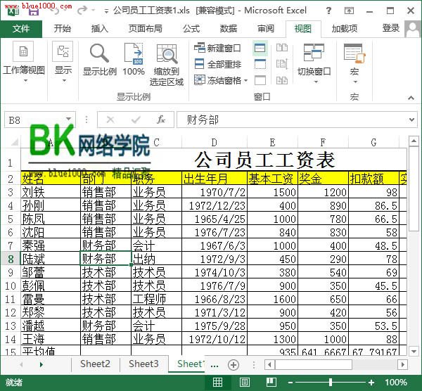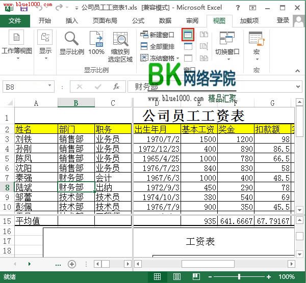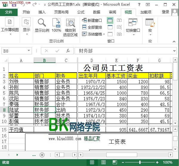 2、來看看效果吧,Excel 2013已經(jīng)按照我們選擇的分界點(diǎn)的左上右下將表格分為4部分了。試試鼠標(biāo)的滾輪你會有驚喜的——每塊的內(nèi)容都可以查看和對比了。