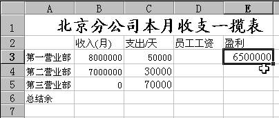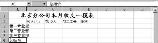 步驟二、在B2、C2、E2、F2單元格中分別輸入“收入/月”、“支出/天”、“員工工資”、“盈利”欄目名稱,如圖 3所示。接著分別在A3、A4、A5、A6單元格中輸入“第一營業部”、“第二營業部”、“第三營業部”、“總結余”項目名。