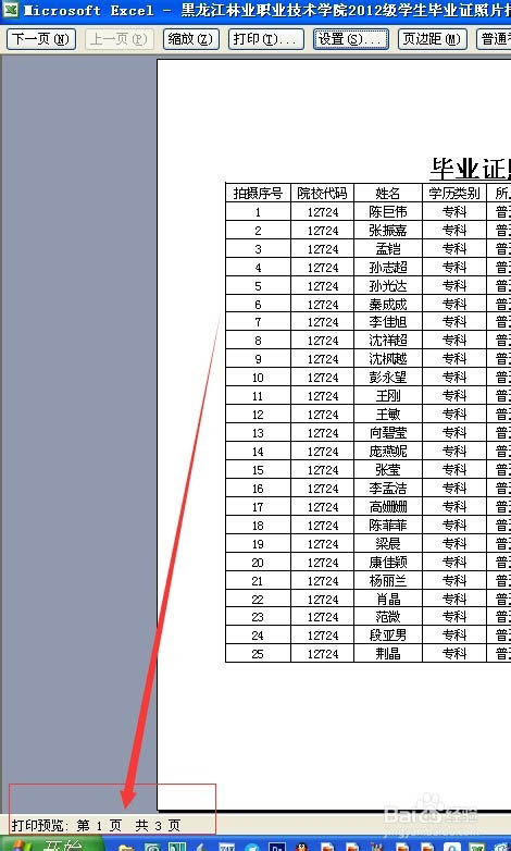 7、點(diǎn)擊預(yù)覽之后觀察箭頭所指位置,這個(gè)表格已經(jīng)被分成三頁顯示了。
