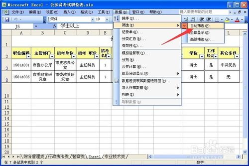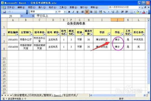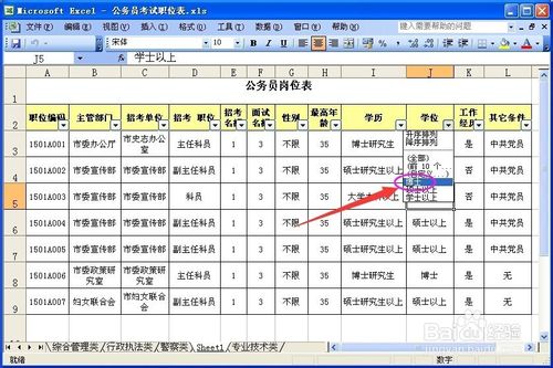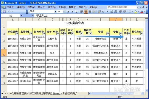 例如:我們給“學位”設(shè)置條件為博士。這時,在工作表中就只顯示“博士”的數(shù)據(jù)列了。