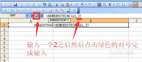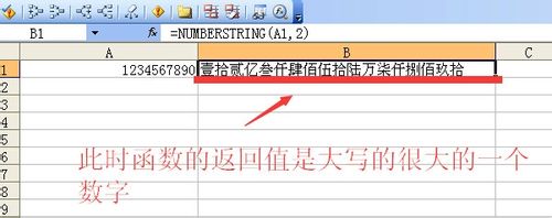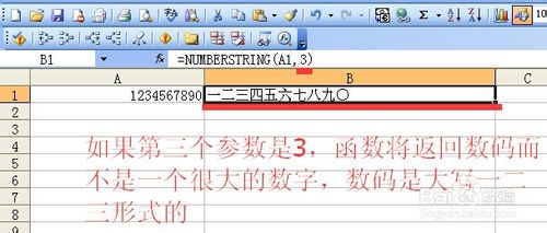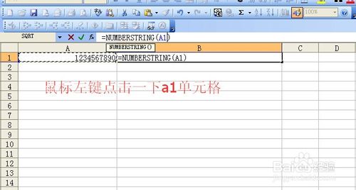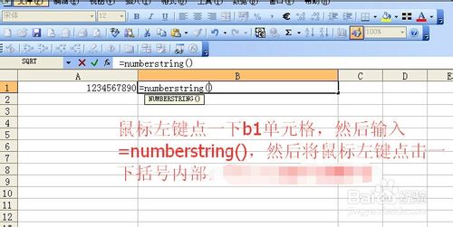 鼠標(biāo)左鍵點一下b1單元格,然后輸入=numberstring(),然后將鼠標(biāo)左鍵點擊一下括號內(nèi)部